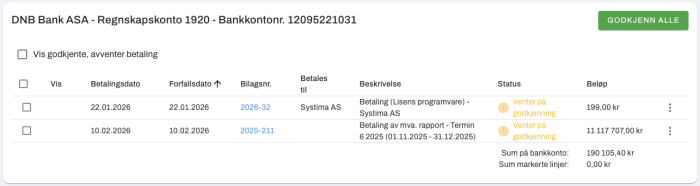 Leverandørfakturaer som er registrert og godkjent i Systima kan sendes til betaling direkte fra systemet. Du velger konto, forfallsdato og hvilke fakturaer som skal betales – resten går via bankintegrasjonen. Når betalingen gjennomføres, blir den automatisk koblet mot riktig bilag i regnskapet. Det samme prinsippet kan brukes for lønnsutbetalinger, slik at lønn, bank og regnskap henger sammen uten ekstra steg.