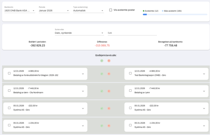 Når bankintegrasjon er aktivert, hentes bevegelser fra banken inn til Systima med jevne mellomrom. Systemet kan foreslå eller gjennomføre matching mot fakturaer, innbetalinger og andre bilag der beløp og dato stemmer. Du ser raskt hva som er avstemt, hva som gjenstår, og hvor det eventuelt er avvik. Det gir en bankavstemming som er raskere, mer oversiktlig og bedre dokumentert.
